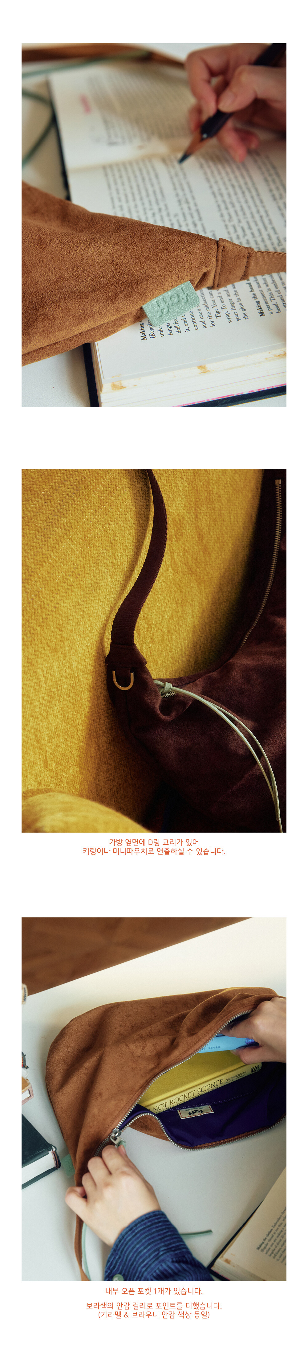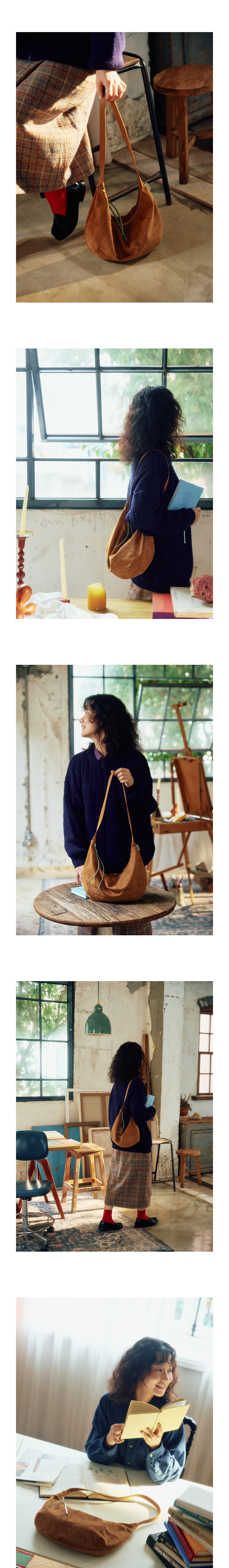스웨이드 소재로 자연스럽게 툭 떨어지는 둥근 쉐입은 차분하면서도 은근히 여유럽고, 도톰한 웨빙 어깨끈을 달아 편안하게 착용할 수 있습니다. 무광 실버 장식, 민트 컬러의 지퍼 플러와 로고는 살짝 빈티지한 멋을 더해주어 단순히 캐주얼한 숄더백이 아닌 조금은 특별한 느낌을 완성해 줍니다.