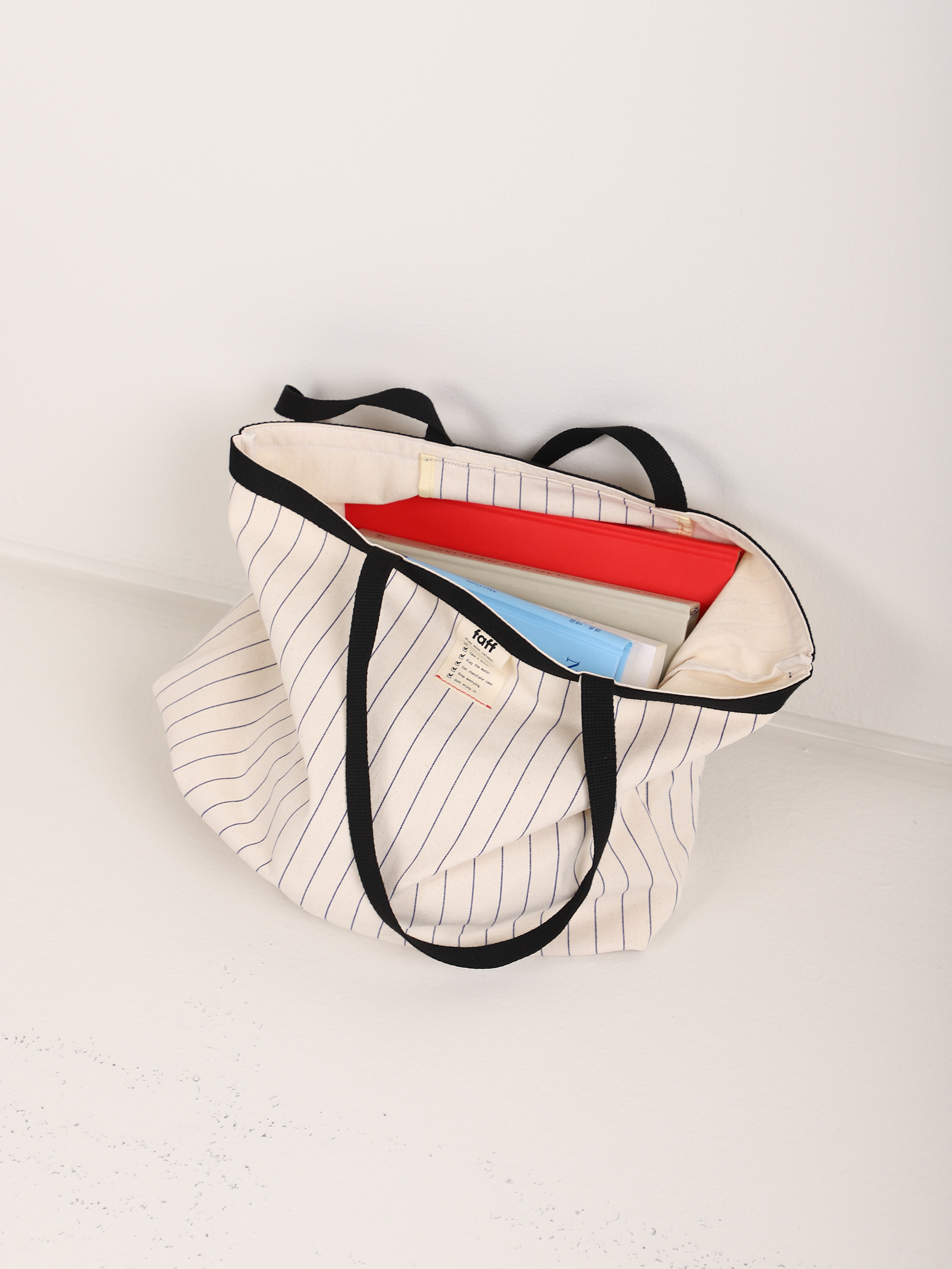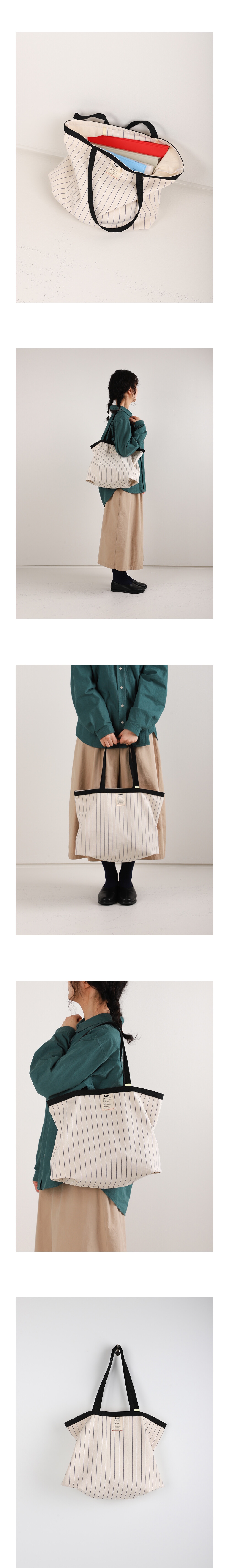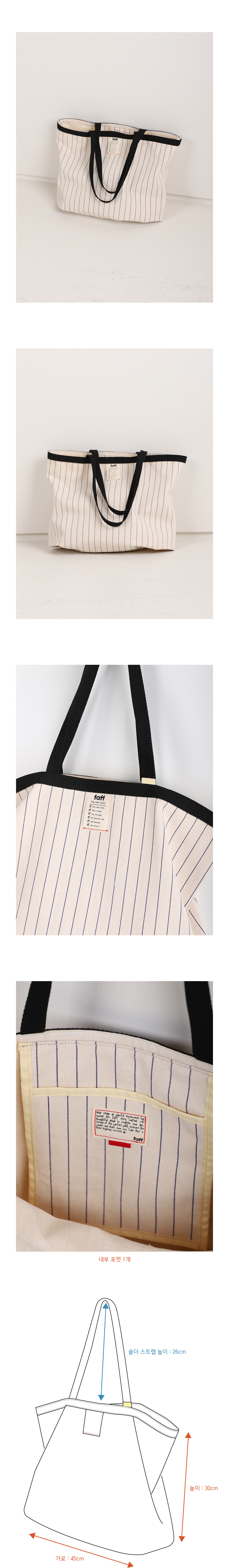 스트라이프 패턴에 감각적인 컬러 포인트를 더해, 넉넉한 수납력으로 매일의 일상을 돕는 실용적인 쇼퍼백입니다.