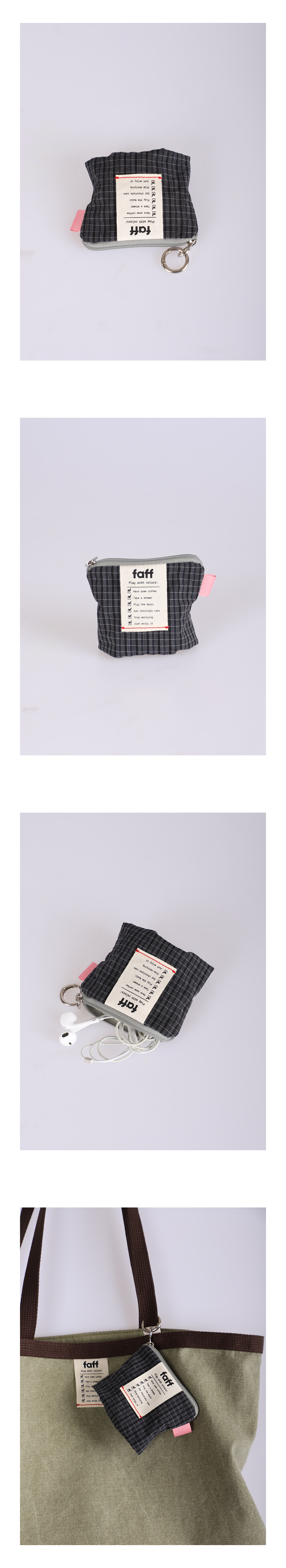 립밤이나 이어폰 같은 작은 필수품을 알차게 담아내고, 키링 연출을 통해 각자의 취향을 완성해주는 미니 파우치입니다.